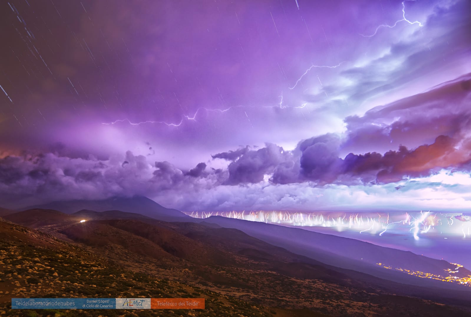 Er war in der Ncht der Unwetter auf Izaña (der Berg mit gleichnamiger Wetterforschungsstationen gleich neben den Sternwarten) und hat 200 Fotos von Blizen geschossen und dies in einem einzigen vereint.
